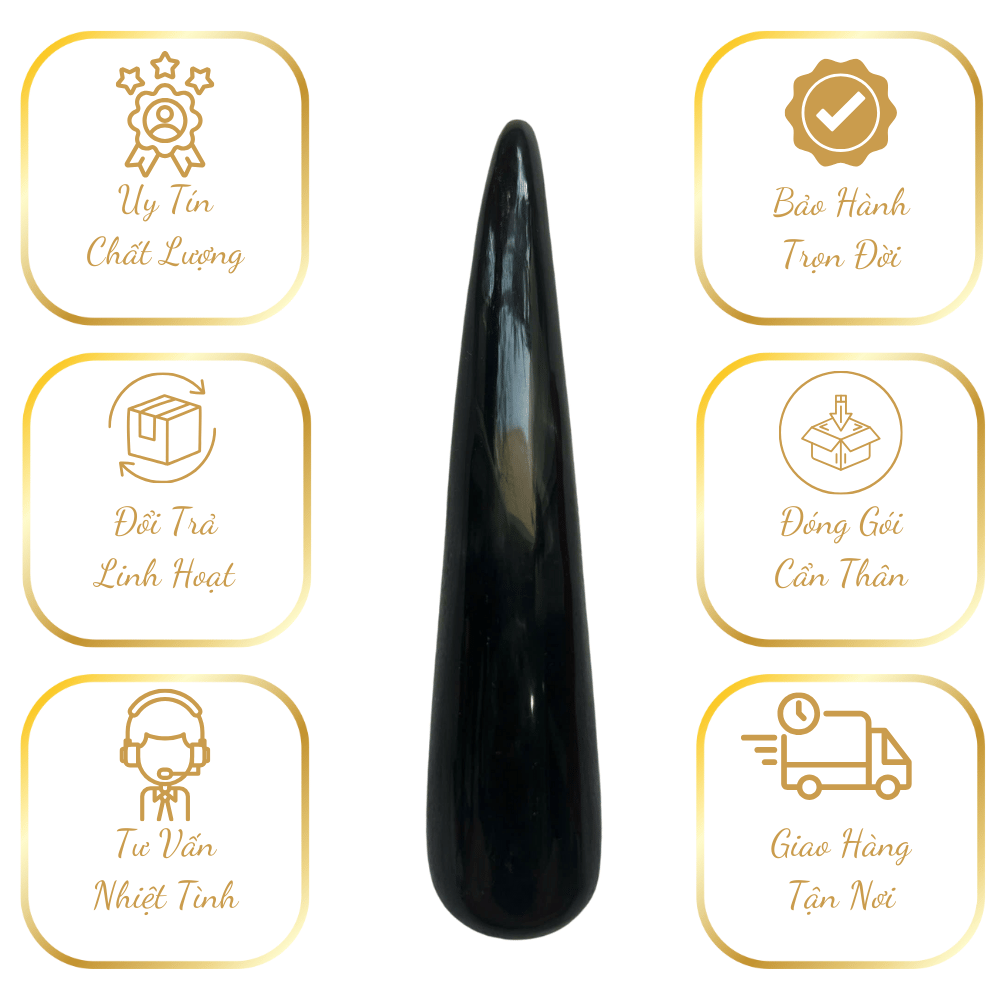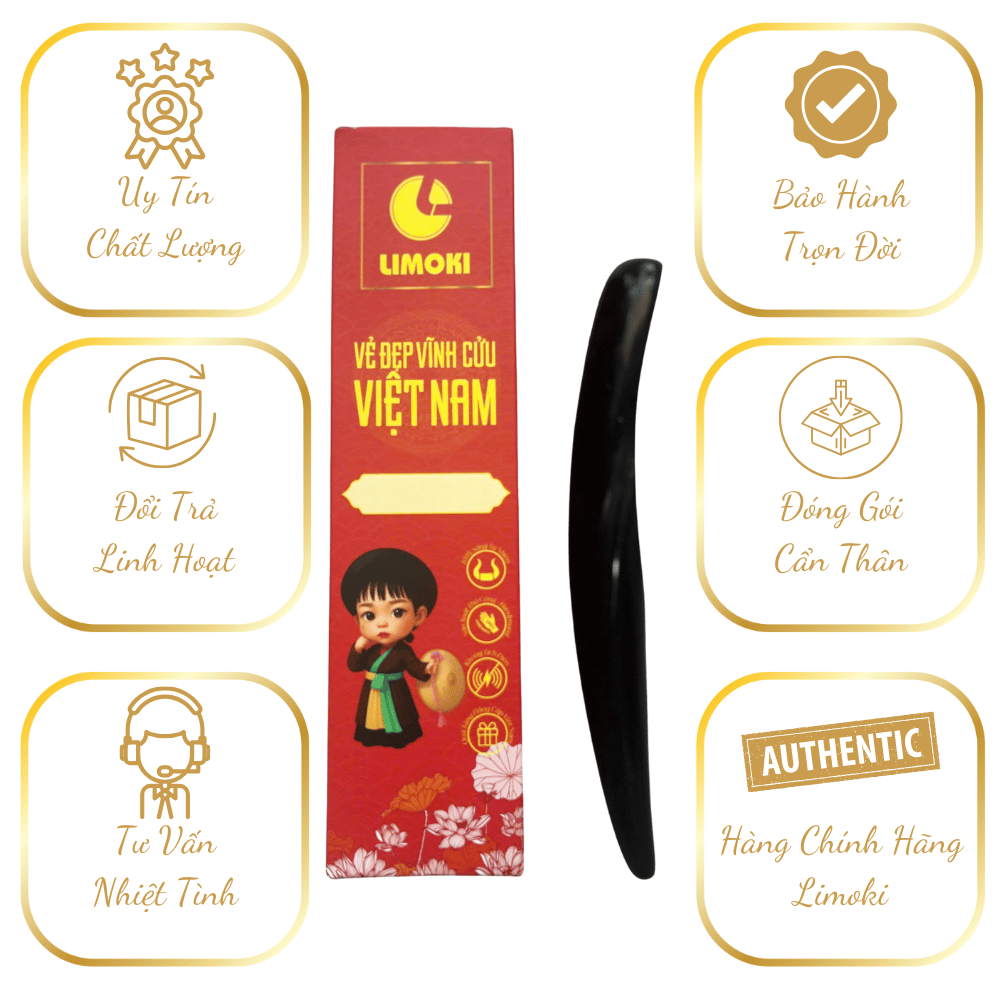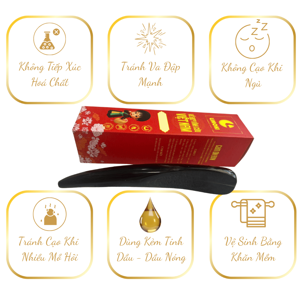 Dùng để day ấn huyệt, cạo (đánh) gió rất êm, không gây tụ máu dưới da. Chất liệu Sừng có khả năng phát tán chướng khí và thông khí huyết.