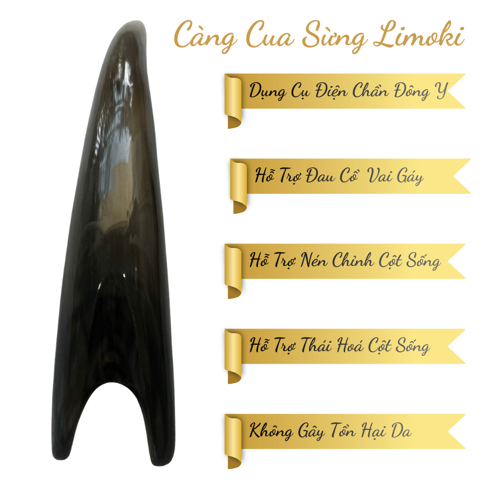 - Càng cua sừng Limoki dùng để ủi trên mặt da chữa đau mỏi cổ vai gáy, co cứng cổ vai gáy.